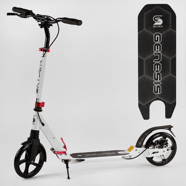 Плавно і безшумно кататися містом можливо завдяки двоколісному самокату від “Skyper Genesis” з дисковим гальмом. Модель обладнана двома амортизаторами та великими поліуретановими колесами 200 мм, шляхом цього їзда буде комфортною та швидкою.