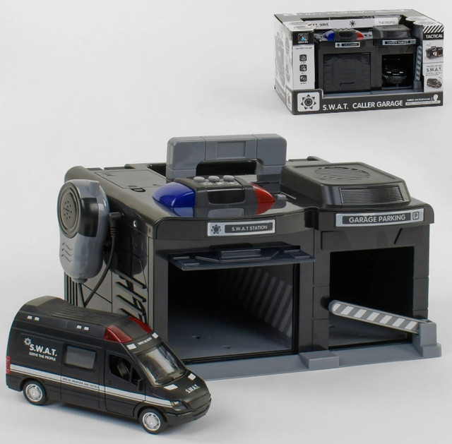 Невеликий гараж з паркінгом для автомобіля виконаний в дуже суворому поліцейському стилі. На кришці є ручка для зручного перенесення конструкції, а всередині вже знаходитися невелика моделька металопластикової машини S.W.A.T. Вона обладнана звуковими ефектами, якщо Ви доторкнетеся до капота, то обов'язково спрацює сигналізація і засвітяться фари. У машини відкриваються передні та задні двері. Всередині розташовується великий, комфортабельний салон з диванами. Моделька стоїть на стоянці за шлагбаумом, який вільно підіймається та опускається.